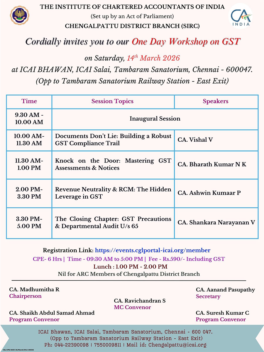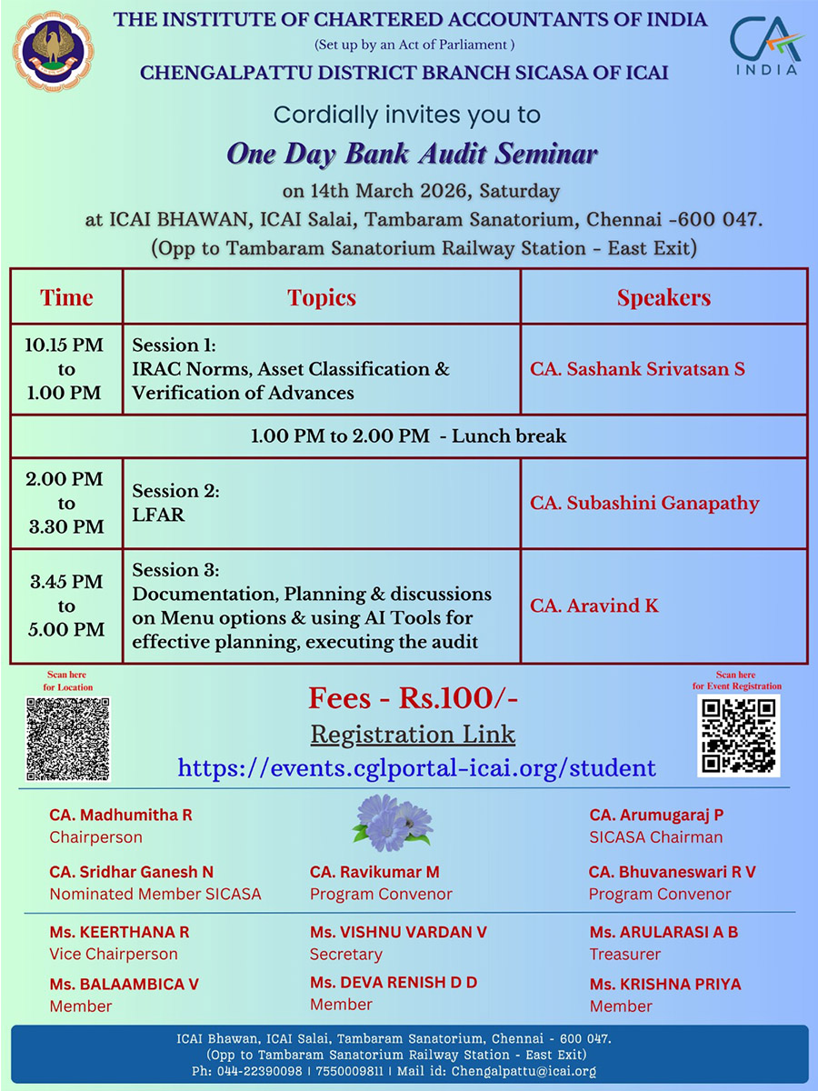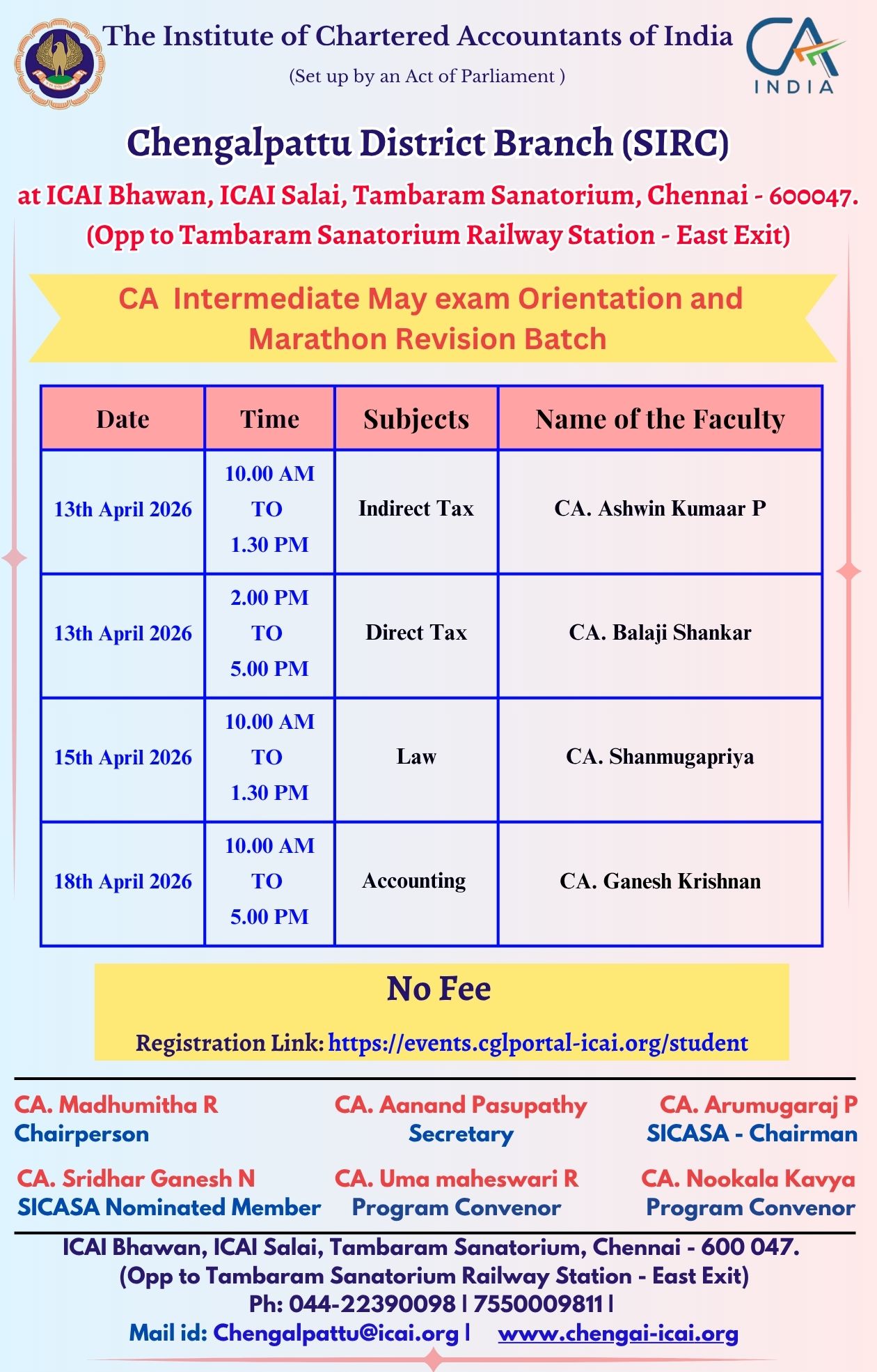 I sincerely invite all members and students to actively participate in the programmes and initiatives of the branch. Together, let us continue to uphold the values of our noble profession and work towards strengthening the professional community in Chengalpattu.