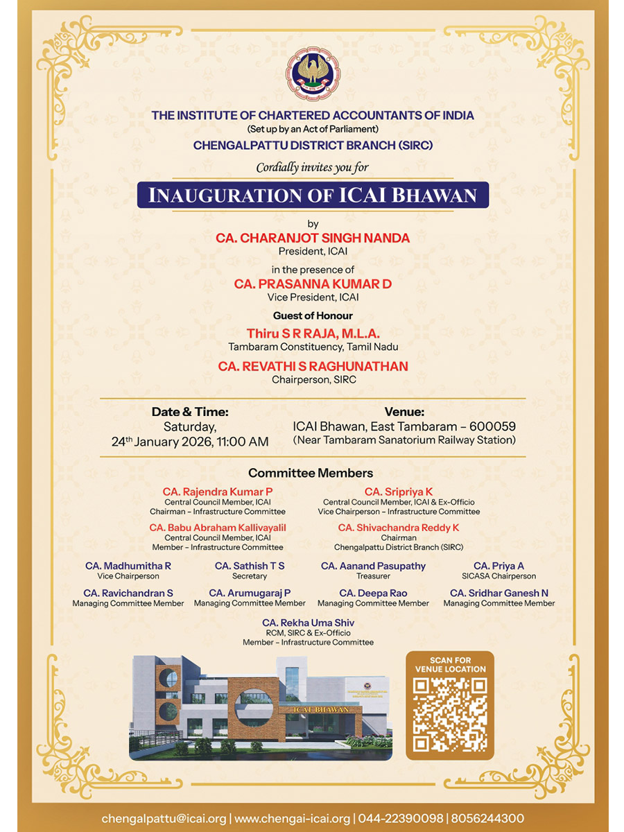 A Historic Milestone for Chengalpattu District Branch. The Chengalpattu District Branch of SIRC of ICAI proudly marks a historic and defining moment with the Inauguration of the ICAI Bhawan at East Tambaram, scheduled on Saturday, 24th January 2026.