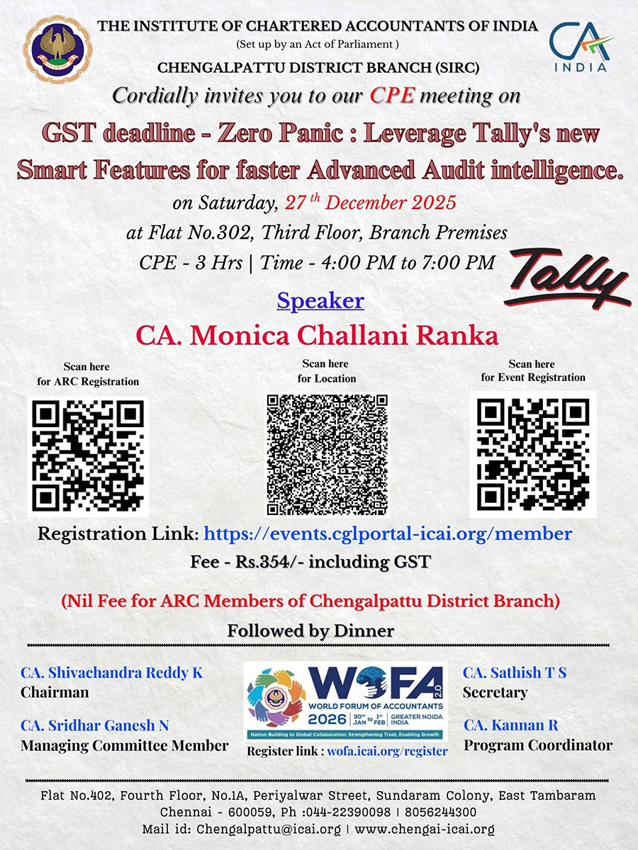 Warm greetings from the Chengalpattu District Branch of SIRC of ICAI. As we step into January 2026, I extend my best wishes to each one of you for a productive, disciplined, and professionally rewarding year ahead. December 2025 concluded on a positive and impactful note, marked by strong member participation and meaningful technical deliberations.